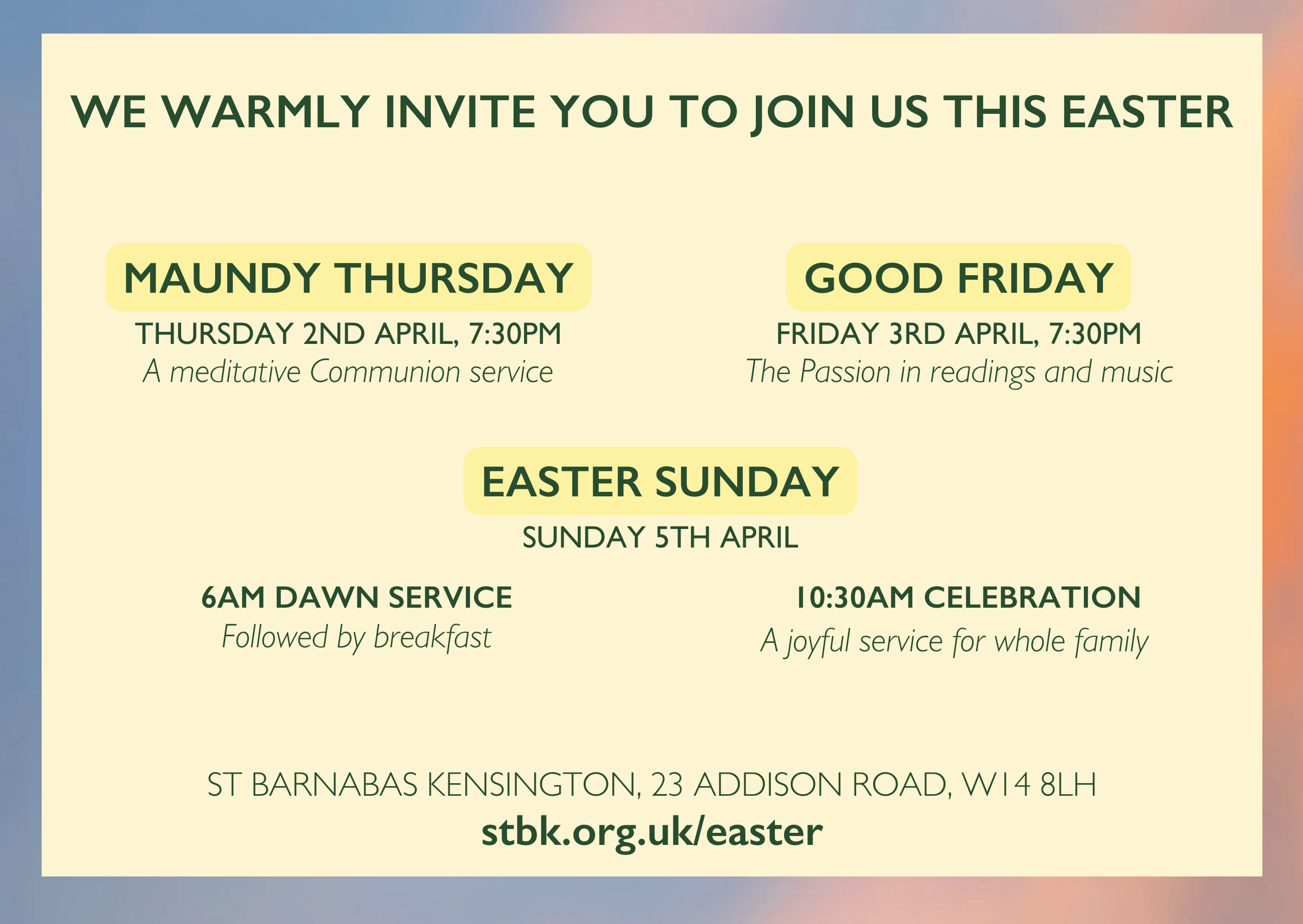 We warmly invite you to join us this Easter! Please note the dates of our Holy Week and Easter services and pray about those you might invite to come on Easter Sunday. Publicity will be available for distribution shortly. More details on stbk.org.uk/easter