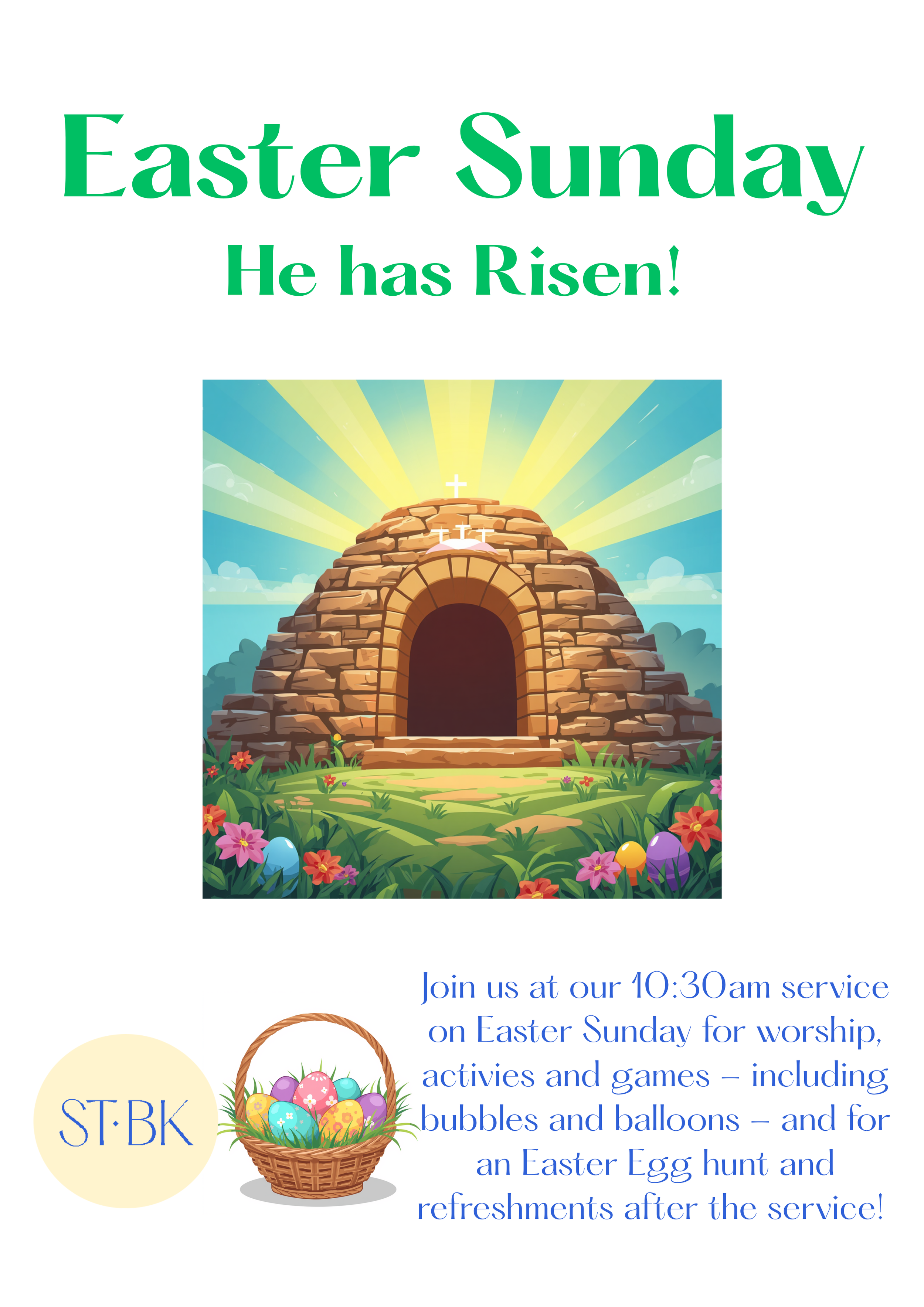 We warmly invite you to join us this Easter! Please note the dates of our Holy Week and Easter services and pray about those you might invite to come on Easter Sunday. Publicity is available at the back of church. More details on stbk.org.uk/easter